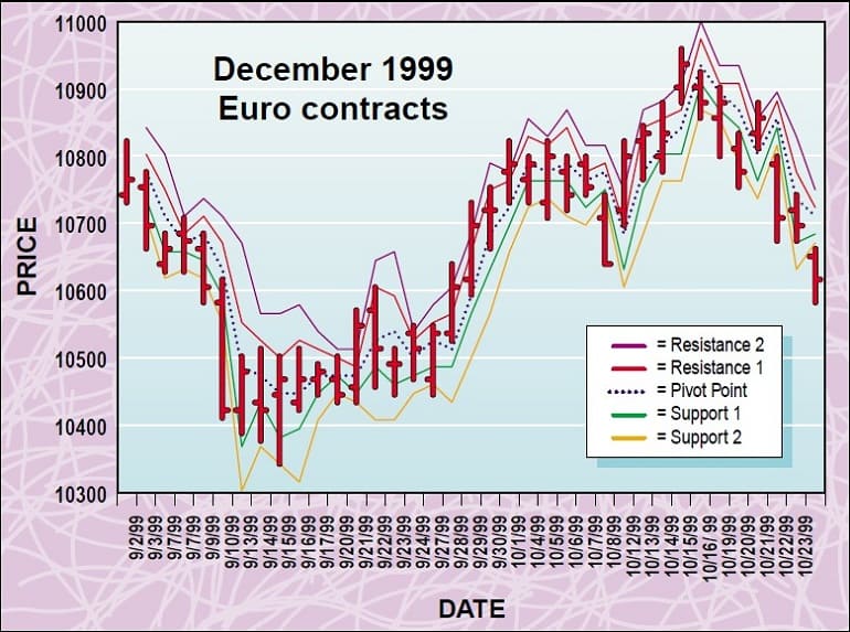 - FIGURE 2: PIVOT POINTS, SUPPORT AND RESISTANCE LEVELS FOR DECEMBER 1999 EURO CONTRACTS. The second support level is touched or penetrated more frequently during a downtrend, and the second resistance level is penetrated or touched more frequently during an uptrend.