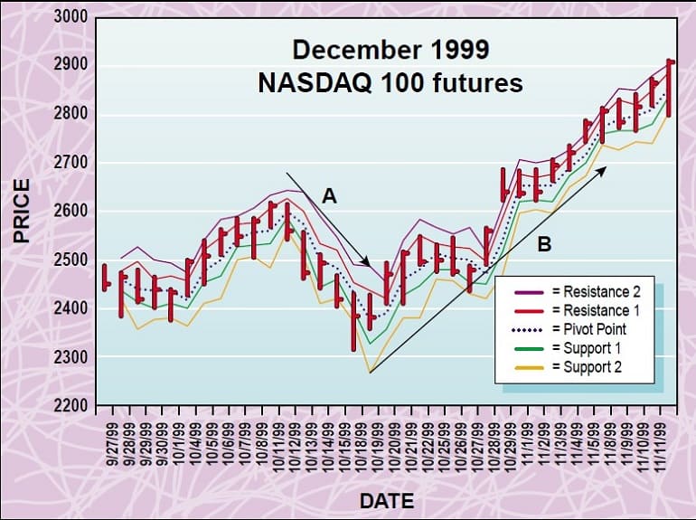 FIGURE 8: PIVOT POINTS, SUPPORT AND RESISTANCE LEVELS IN ACTION. You can see how pivot points and the support and resistance levels play a significant role in the December 1999 Nasdaq 100 contracts.