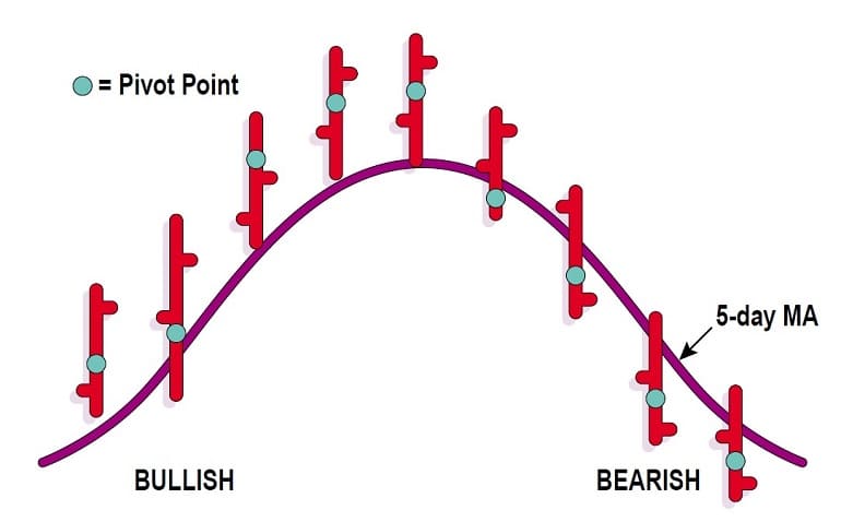 - FIGURE 4: PIVOT AND THE AVERAGE. In looking at the five-day moving average to determine the weekly trend, if the pivot is above the average, a bullish trend is indicated, but if it is below, that is bearish.