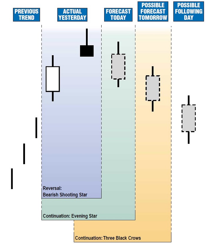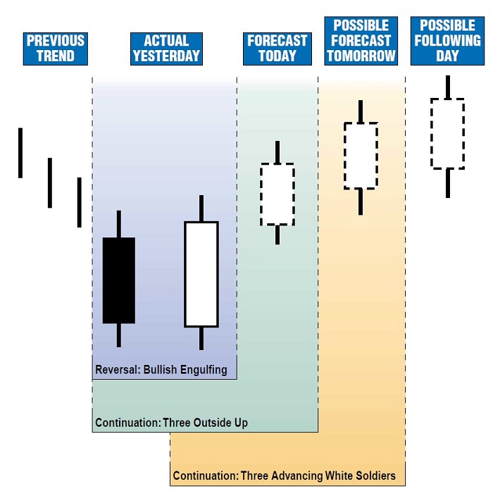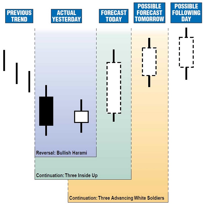 When two or more candlesticks are combined, they produce patterns that fall into two categories: those that are used to predict turning points and those that predict a continuing price trend. Typically, when there is a bullish pattern, there is also an inverse bearish pattern, as can be seen in Figure 2. Patterns are determined from yesterday’s price action and not only identify today’s likely price trend, but in some cases, tomorrow’s price as well.