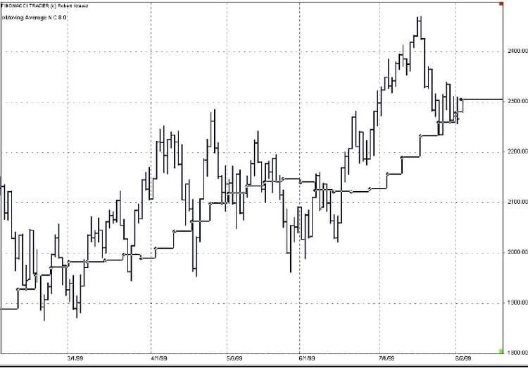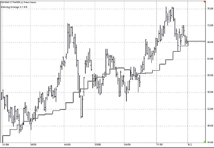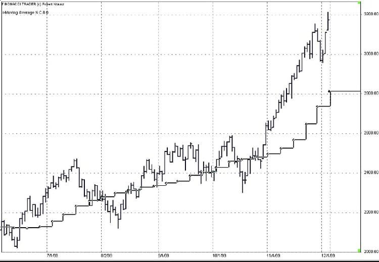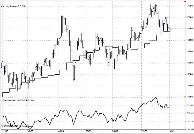 Looking at Figure 2, which is a daily chart with an eight-week moving average plotted in step formation from Friday-to-Friday’s close on the daily bar chart, I can see that the eight-week moving average for SUNW had been rising at a fairly steady rate. I then compare that performance to the Nasdaq 100 in Figure 3 over the same period.