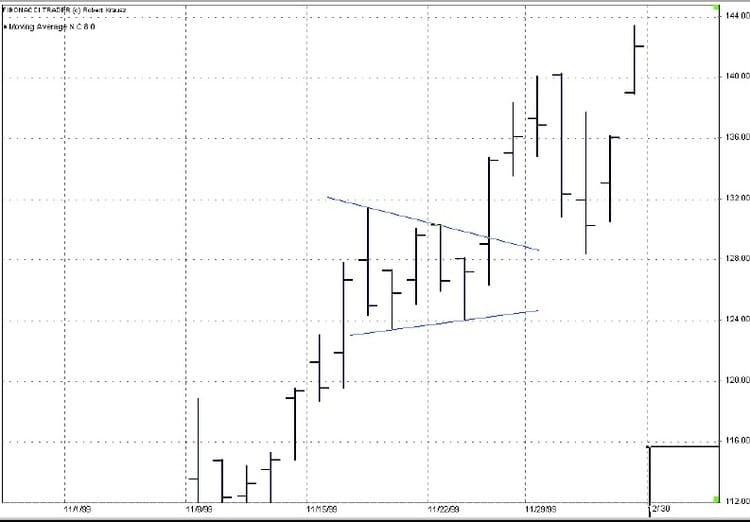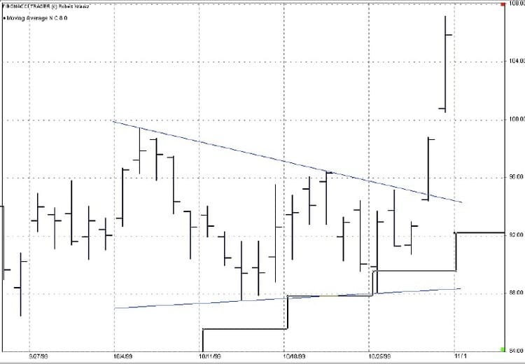Figure 8 shows a short-term version of another continuation triangle — a dynamite triangle. On November 17, the stock made an isolated high; on November 18, it completed the isolated low, then went up for two days to make another isolated high, back down for one day, and then broke out while completing the last isolated low. This one was tight, but it was another sign of the stock’s strength.